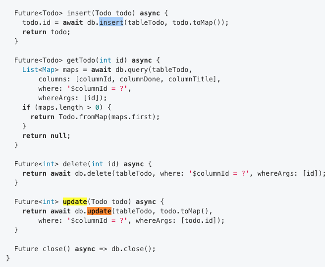 map을 사용할 수 있는 raw 함수가 아닌 sqflite 함수를 사용해 보겠습니다