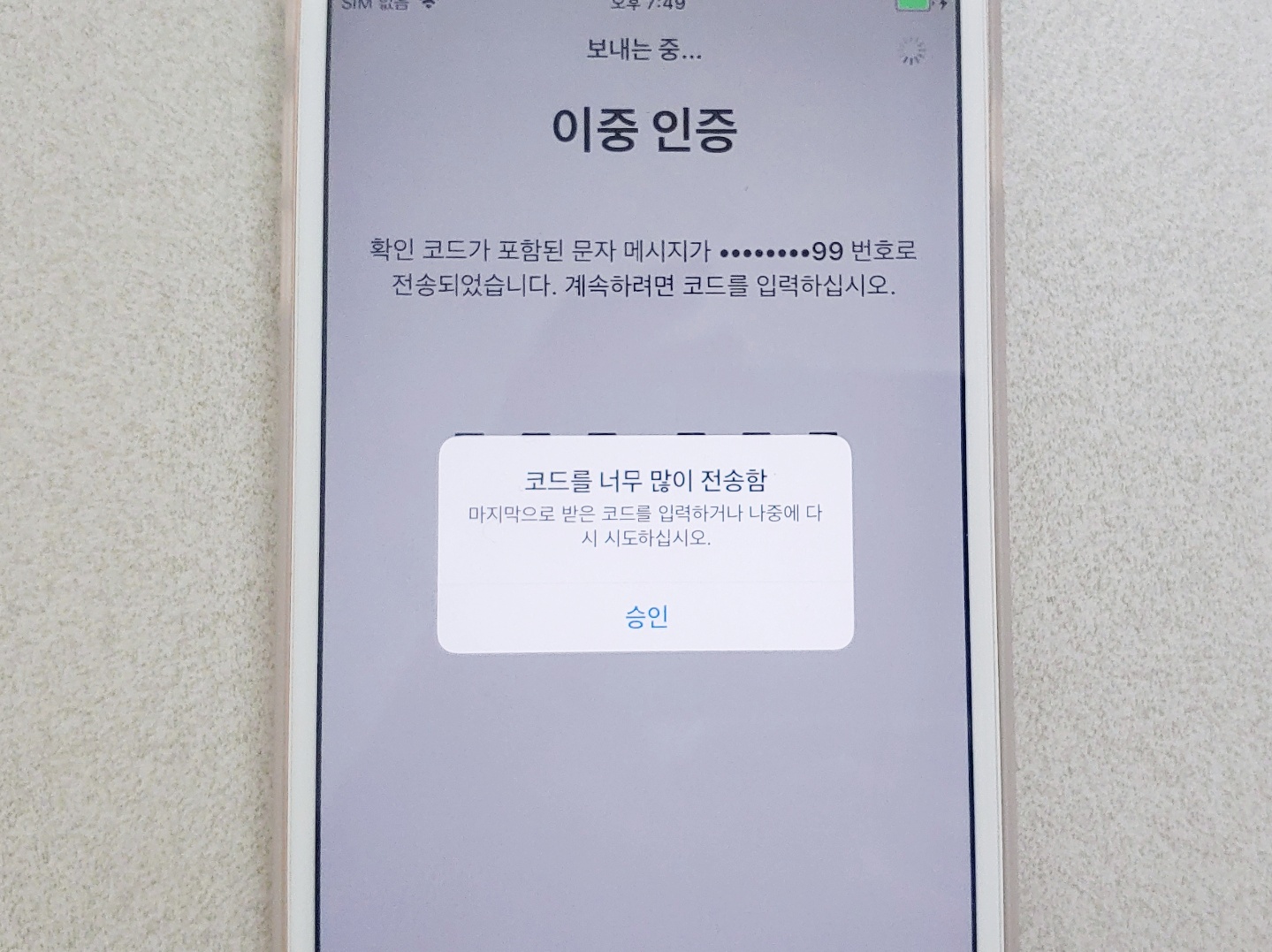 "이중인증 문자 코드를 너무 많이 전송함" 이 메세지가 있는 팝업 화면이 뜨면 더 이상 인증을 받을 수 없는 계정 잠금 상태가 되버린겁니다.