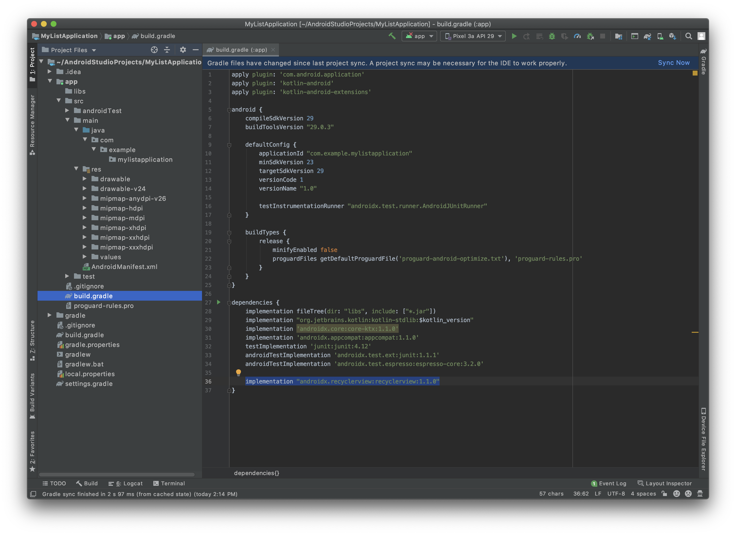 잠깐의 동기화 과정이 끝나면 프로젝트에서 recyclerview를 사용할 수 있게 됩니다.