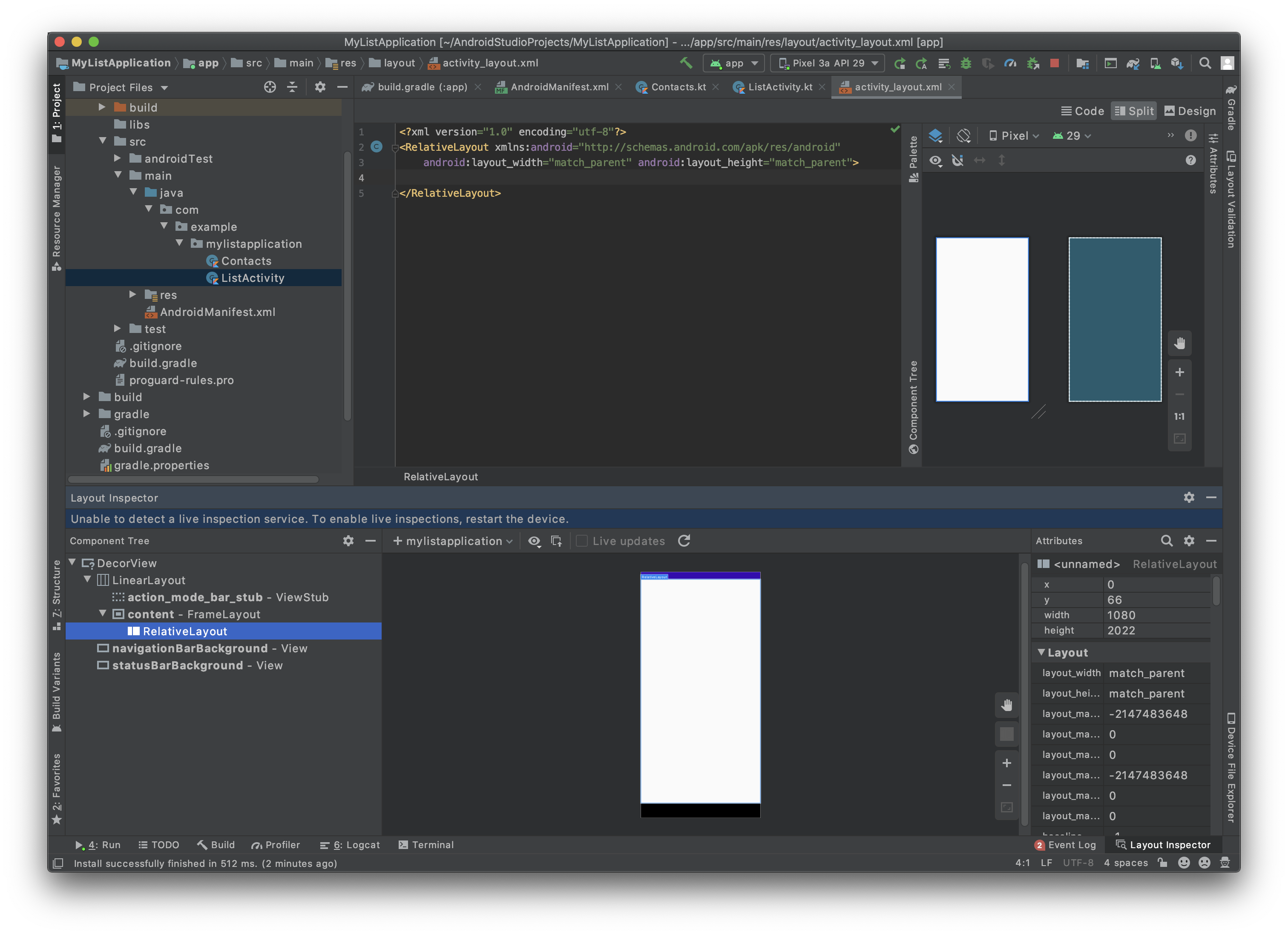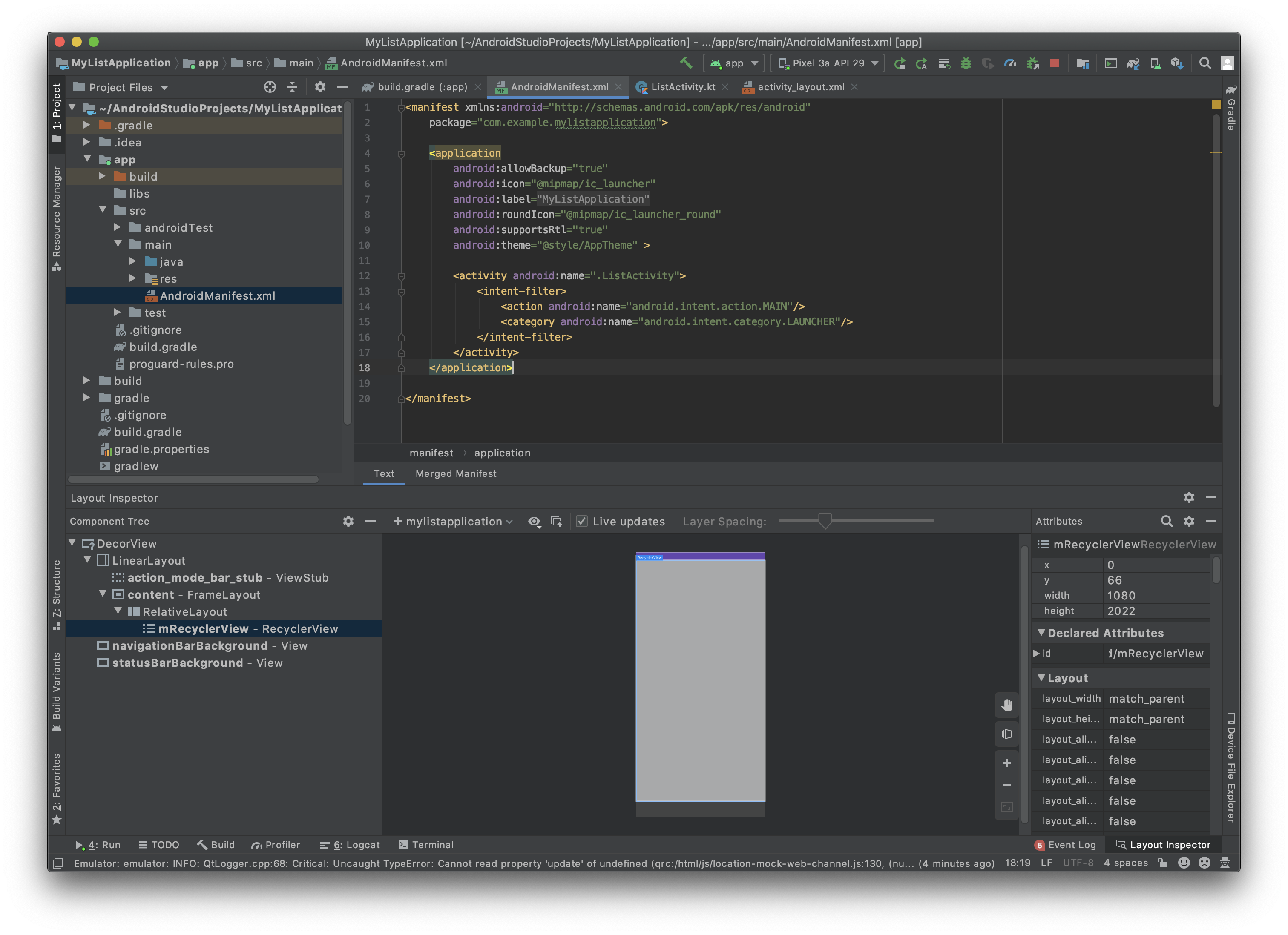 Layout Inspector가 실행되면 작성한 recyclerView가 Activity에 잘 반영된 걸 볼 수있습니다.
