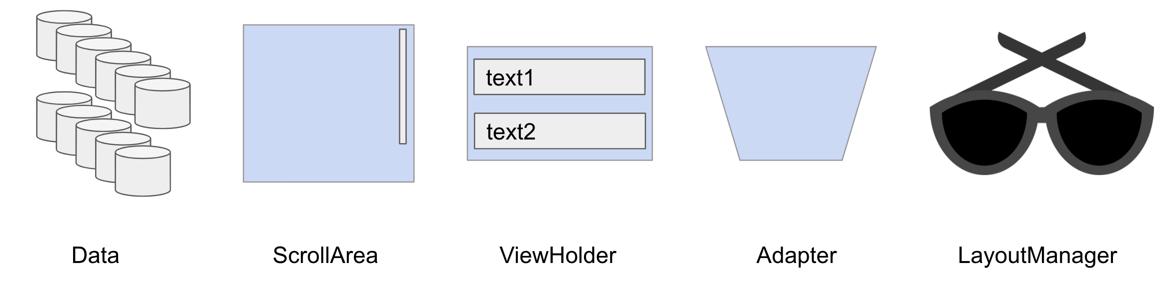 리스트뷰는 크게 5가지 요소(Data, ScrollArea, ViewHolder, Adapter, LayoutManager)로 나뉠 수 있습니다