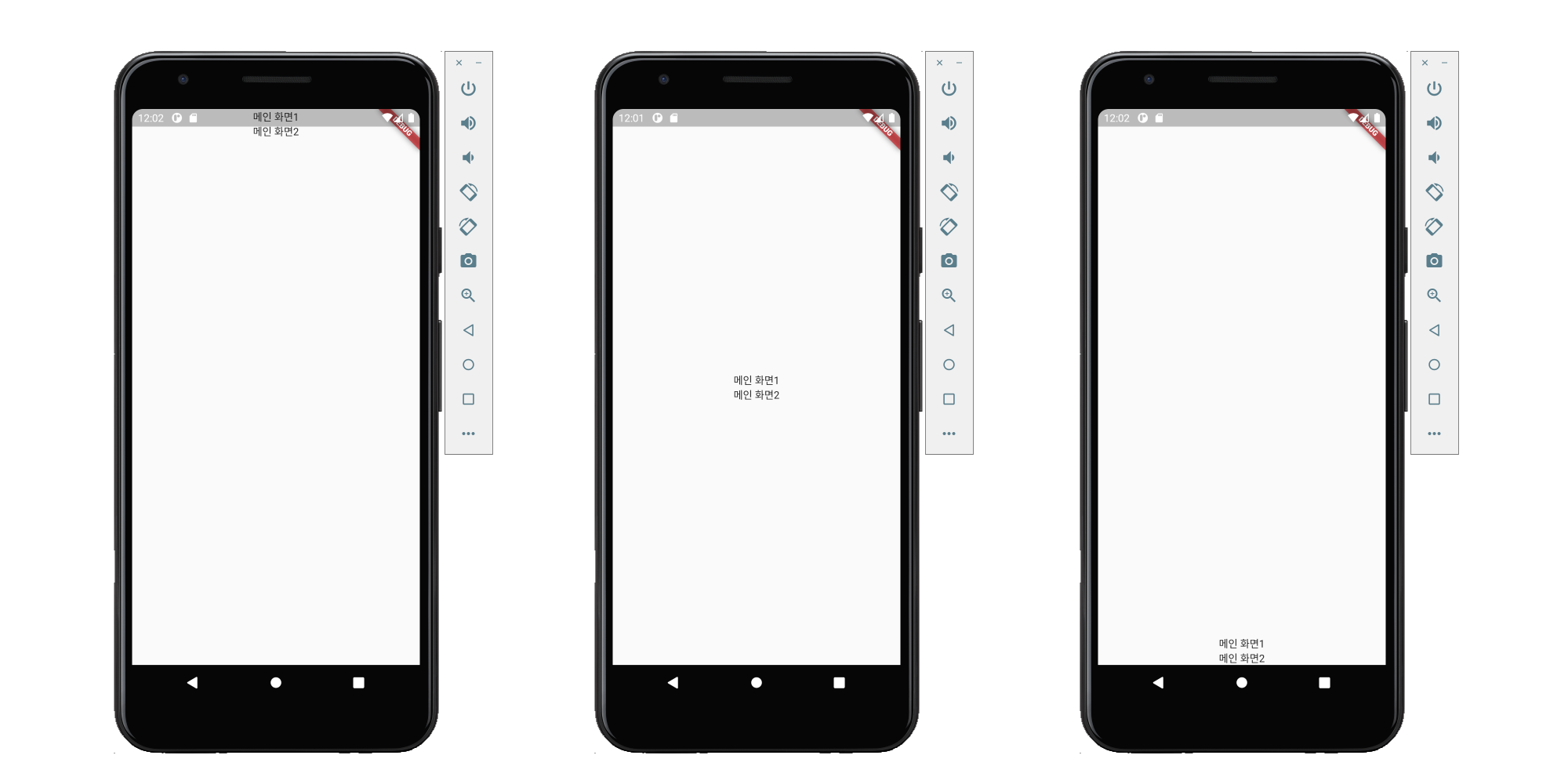 "MainAxisAlignment.start, MainAxisAlignment.center, MainAxisAlignment.end"를 이용해서 정렬을 바꿀 수 있습니다.