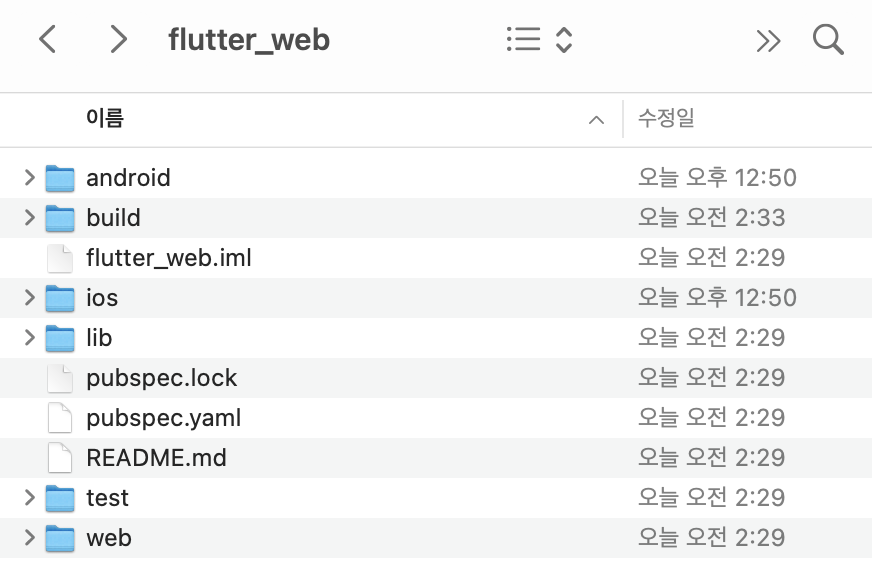 - build : flutter 빌드에 사용되는 파일을 담는 폴더
