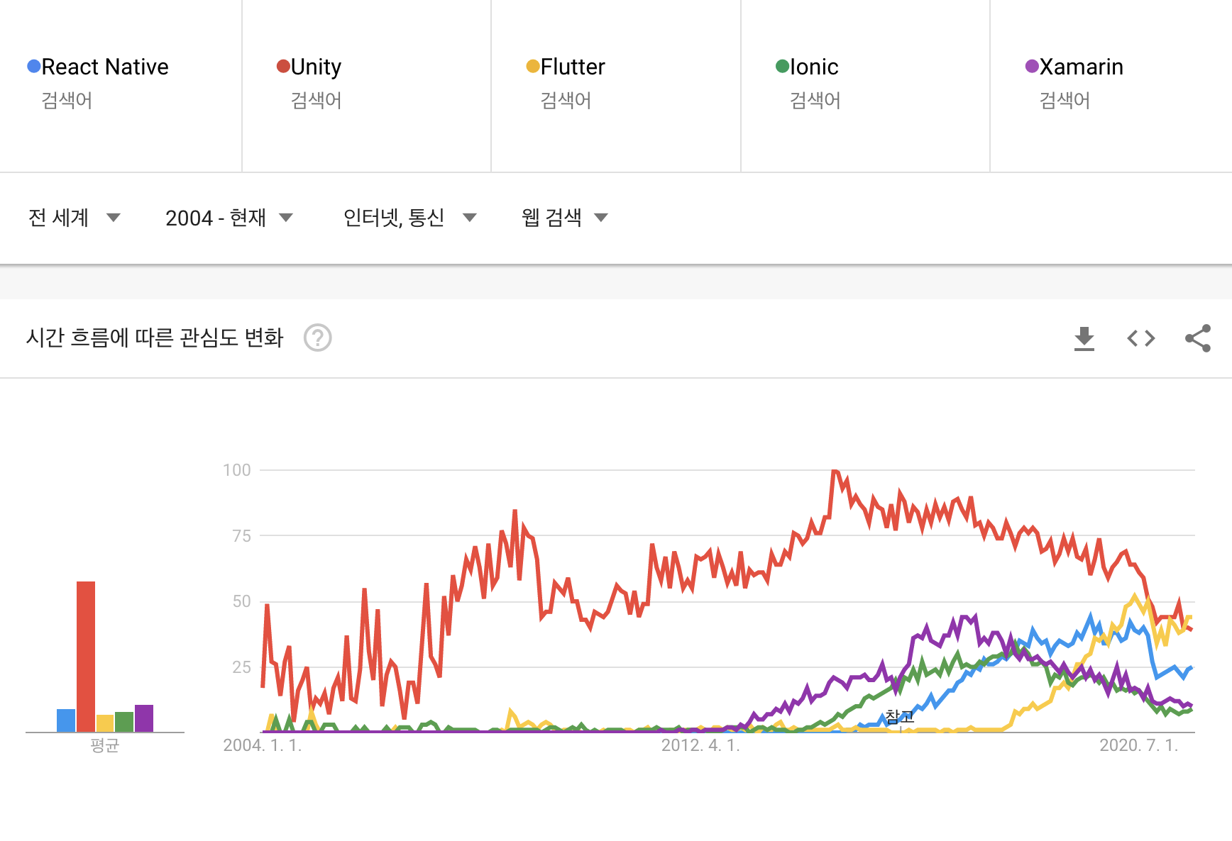 그에 비해 Flutter의 관심이 엄청 높아졌네요