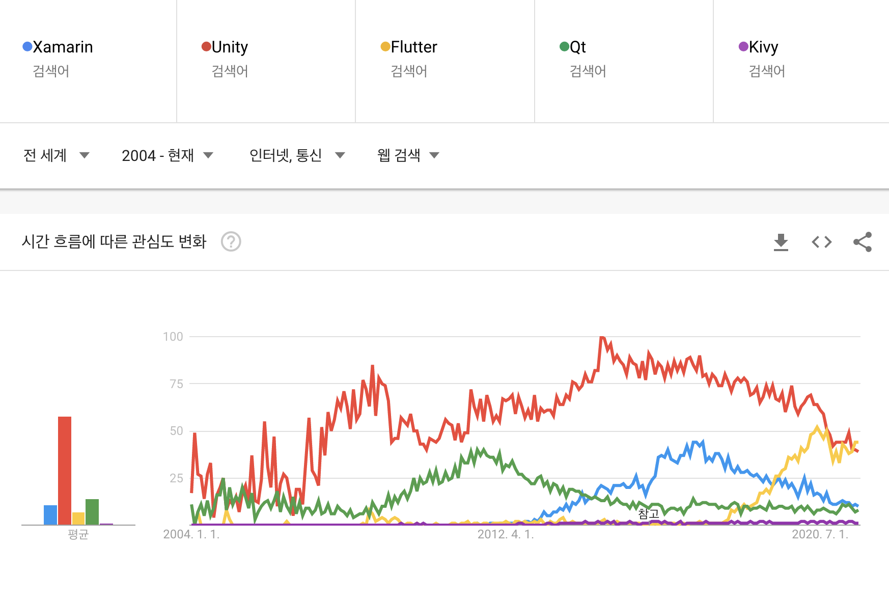 C++을 이용해서 개발하던 Qt는 C++이 인기가 줄면서 부터 트랜드가 낮아지기 시작했고, C#이 인기가 생기면서 같이 생긴 Xamarin이 트랜드가 높아졌습니다.