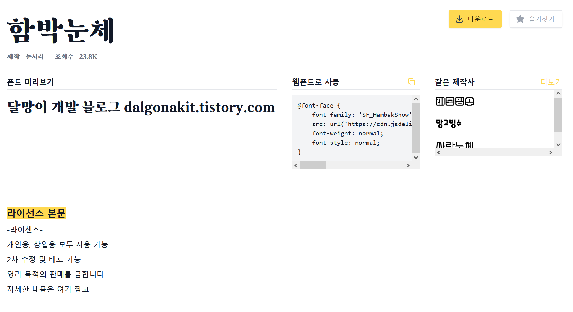 폰트 사용에서 가장 민감한 라이센스는 폰트 소개 아랫부분에 바로 나와 있어요