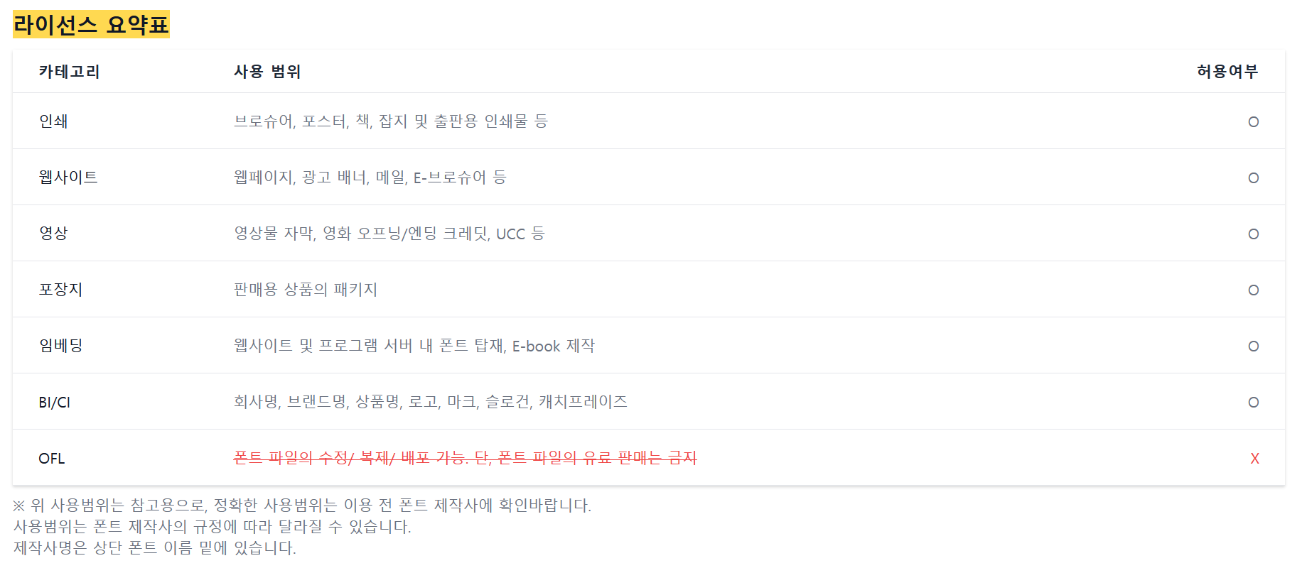 폰트의 인쇄, 웹사이트, 영상, 포장지, 임베딩, BI/CI, OFL 까지 다양하게 요약해서 보여주고 있습니다.