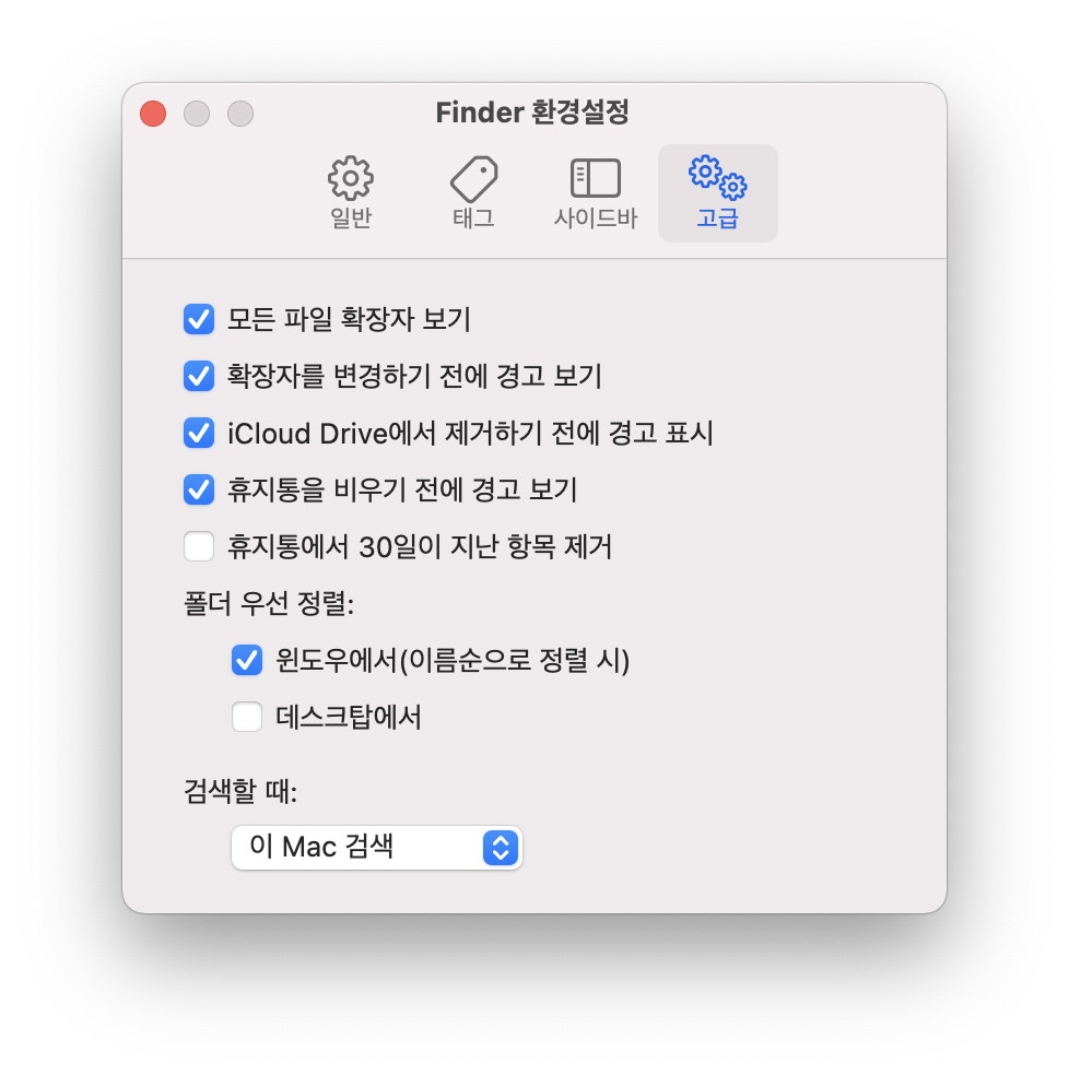 검색 할 위치를 [현재 폴더 검색]이 아닌, [이 Mac 검색] 으로 변경합니다.