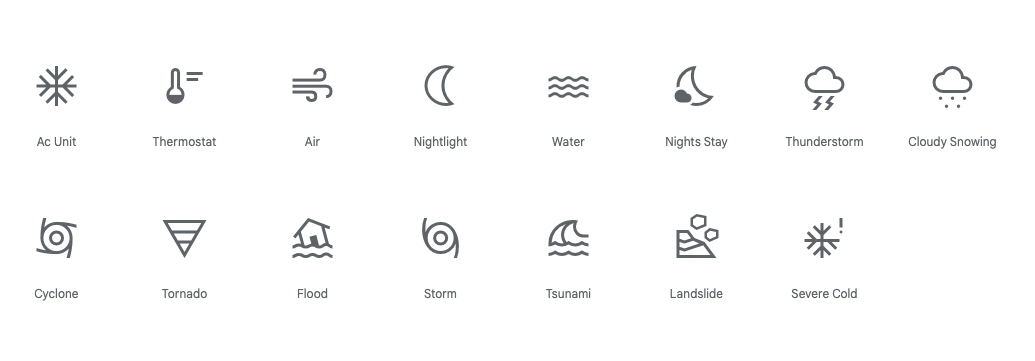 항상 무료로 아이콘을 제공받던 구글의 머테리얼 아이콘( https://material.io/design/iconography/system-icons.html#design-principles ) 사이트 조차도 날씨가 상세하지 않음... https://fonts.google.com/icons?icon.query=weather