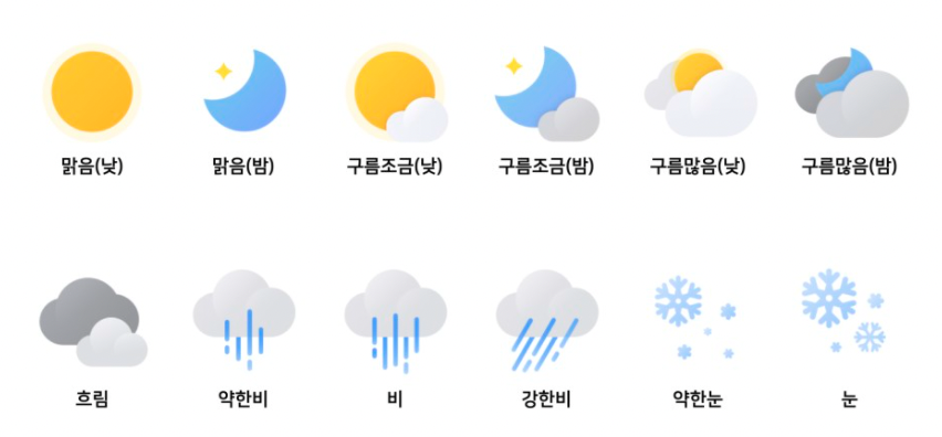 네이버 ( https://blog.naver.com/naver_weather/222057189278 )는 그나마 말랑말랑한 귀여운 아이콘을 많이 쓴다곤 하는데.. 회사 입장에서 무료로 쓸 수 있는게 아니니.. 그림의 떡;
