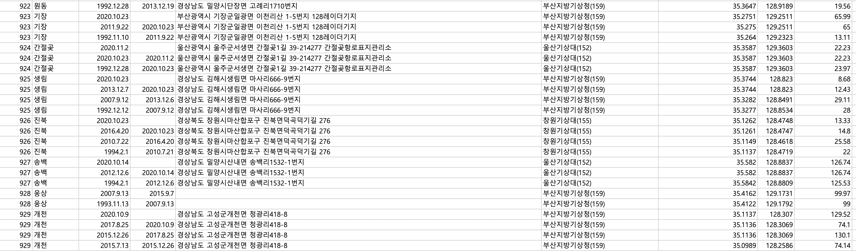 [공공데이터 포탈의 기상청_지상(방재, AWS)기상관측자료 조회서비스 https://www.data.go.kr/data/15057084/openapi.do ]에서 위치가 제공되며, 변화를 엑셀로 파악할 수 있음. 물론 관측소(AWS, 이름이 익숙하지만 개발자가 생각하는 그거 아님)의 위치와 위도,경도, 고도, 관리관서 까지 나오고 있다.