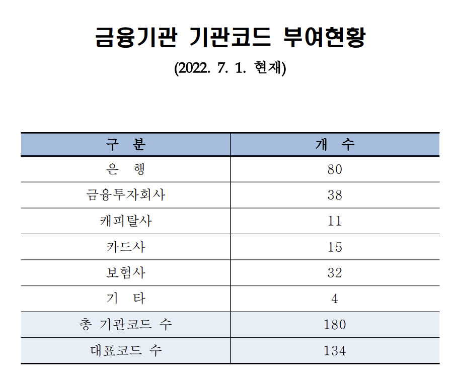 은행코드 (코드/기관명) - 2022.07.01 기준