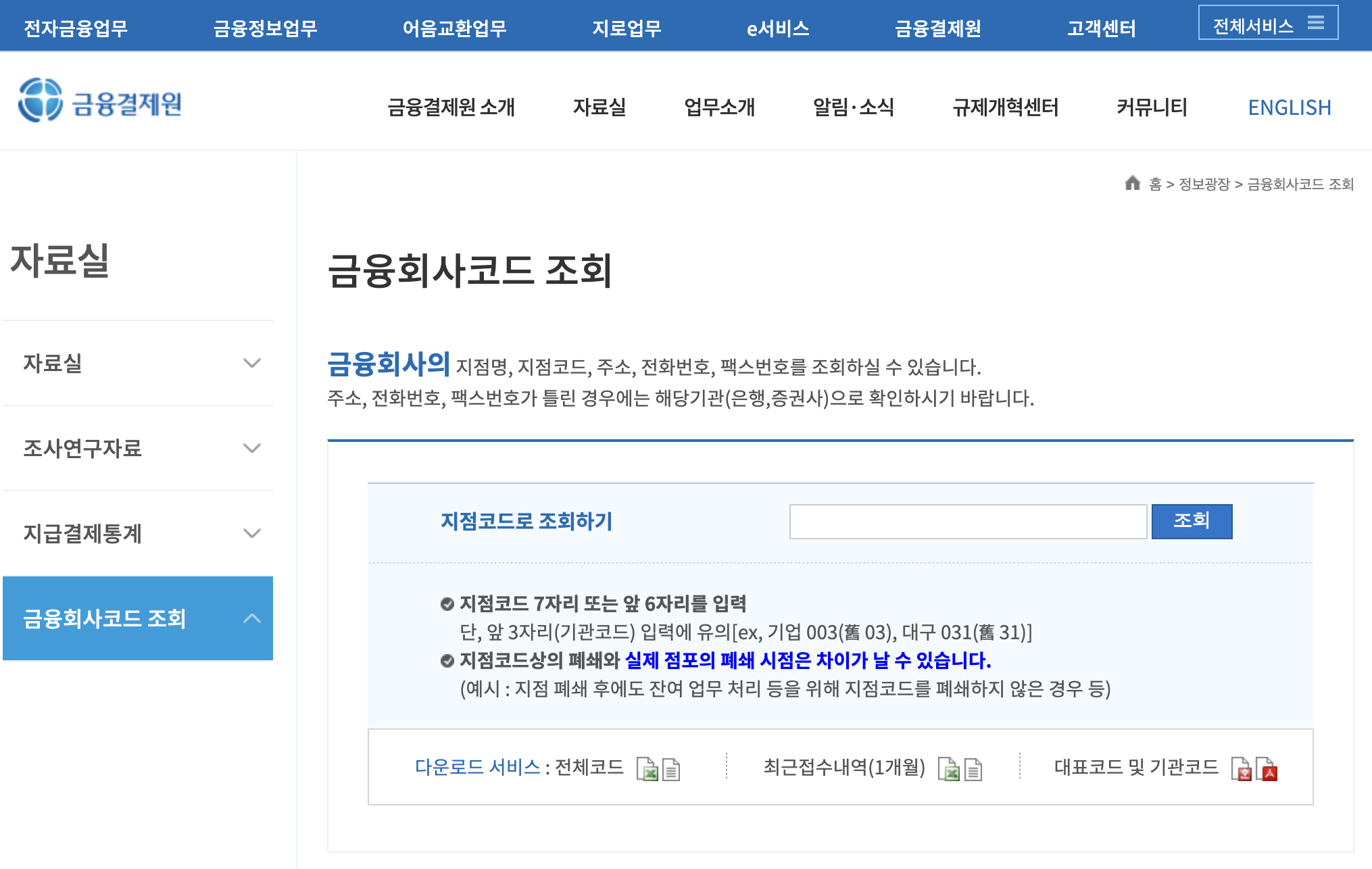 은행의 정확한 지점코드를 알아보기위해선 대표코드 파일을 받아봅니다.