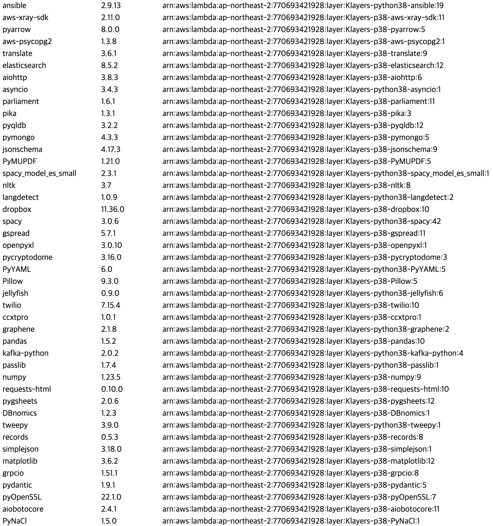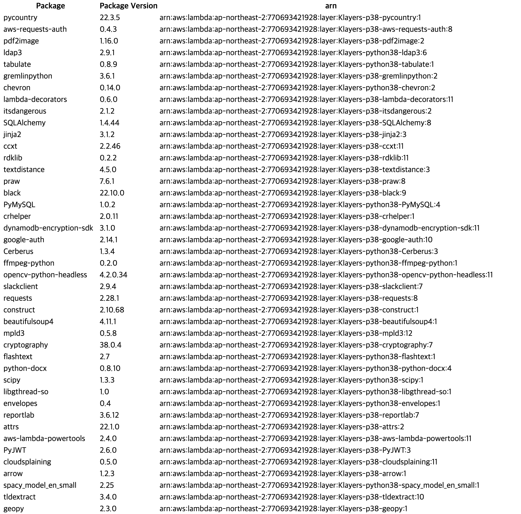| aws-psycopg2 | 1.3.8 | arn:aws:lambda:ap-northeast-2:770693421928:layer:Klayers-p38-aws-psycopg2:1 | |