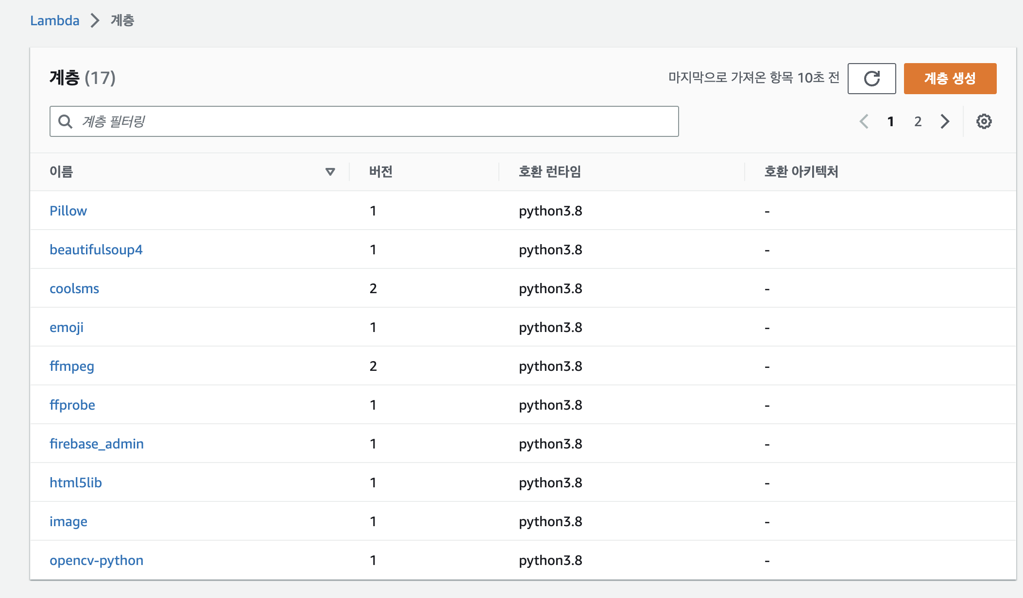 | lambda-cache | 0.8.1 | arn:aws:lambda:ap-northeast-2:770693421928:layer:Klayers-python38-lambda-cache:1 | |