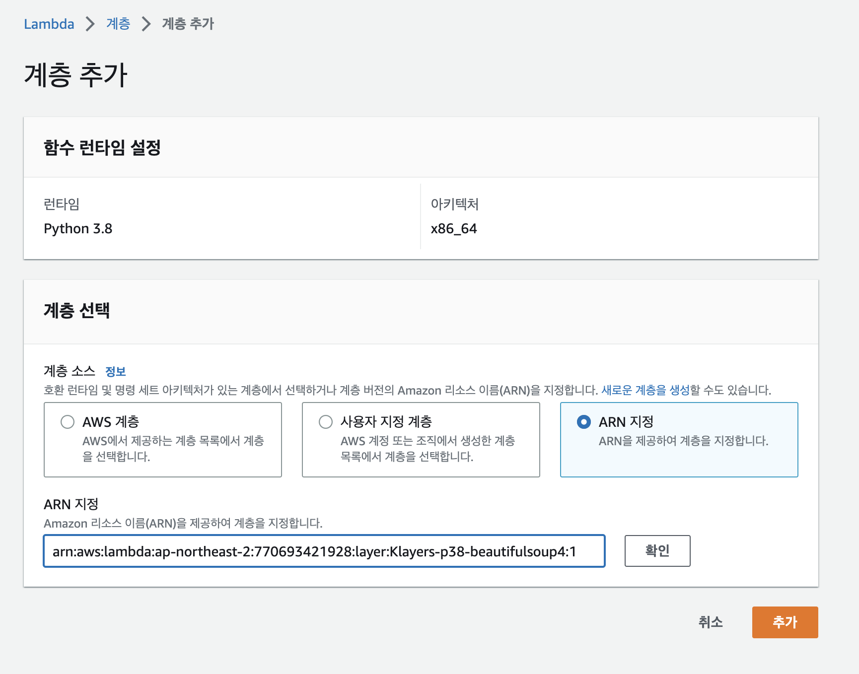 | beautifulsoup4 | 4.11.1 | arn:aws:lambda:ap-northeast-2:770693421928:layer:Klayers-p38-beautifulsoup4:1 | html또는 xml 파서 |