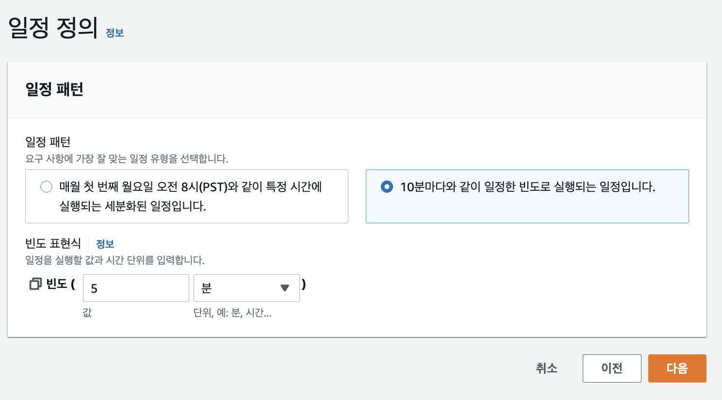 위 사진처럼 lambda-warmer라고 이름을 짓고, 규칙 유형을 '일정'으로 선택해 줍니다.