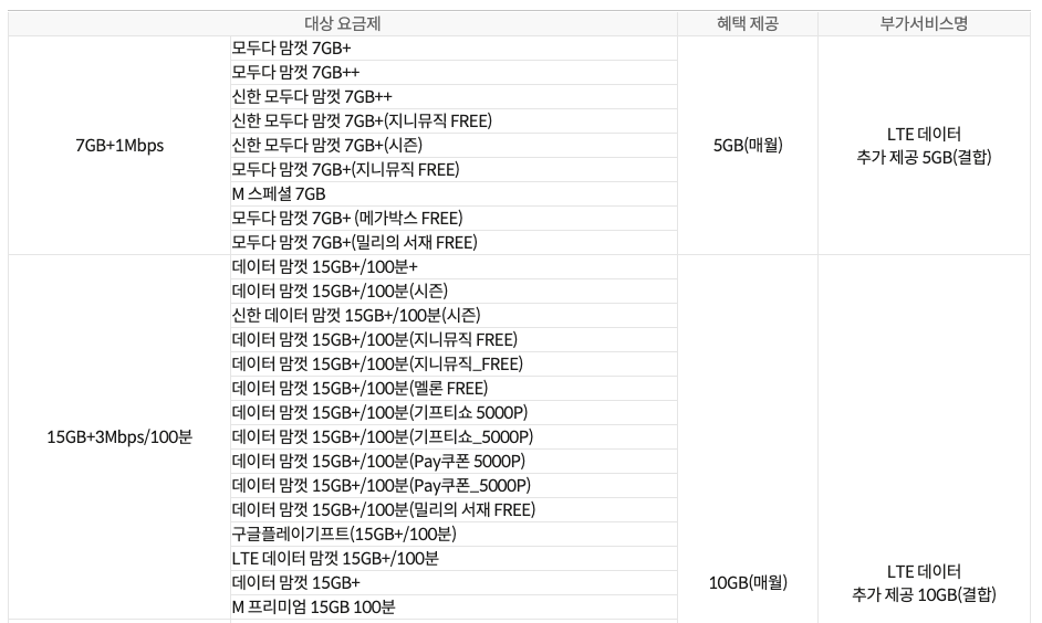 아래 요금제 리스트에 포함되면, 추가로 데이터를 더 주는 이벤트 입니다.