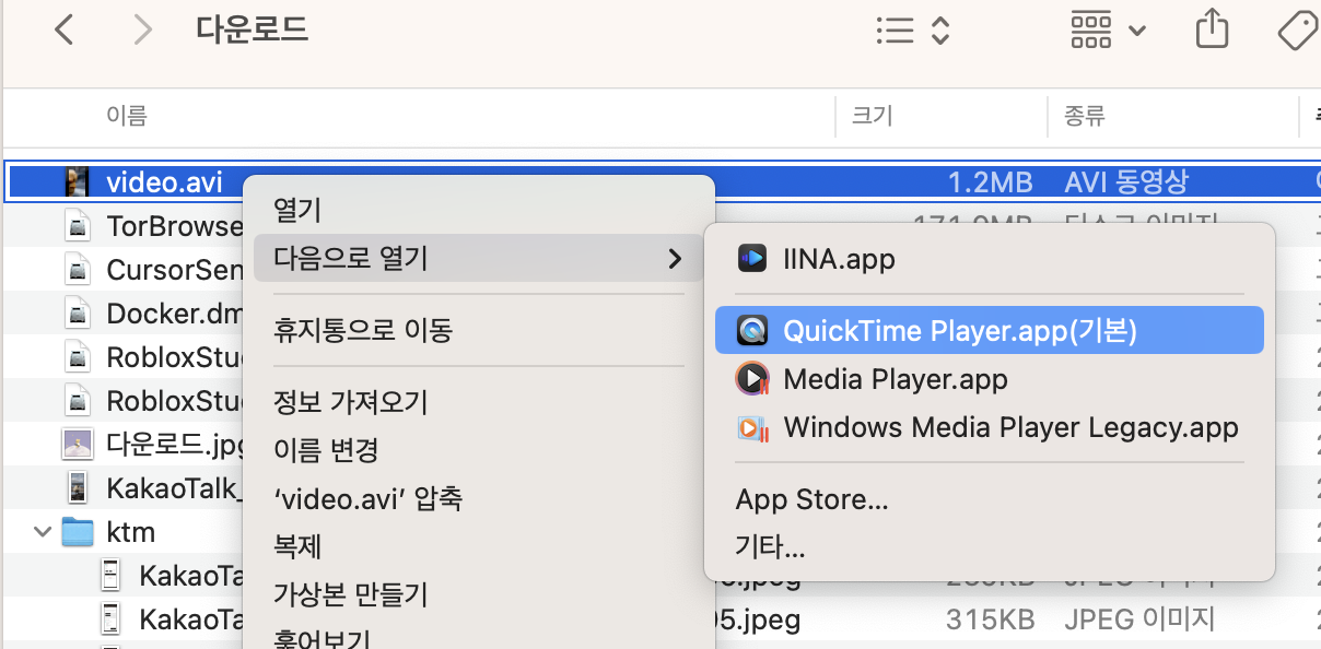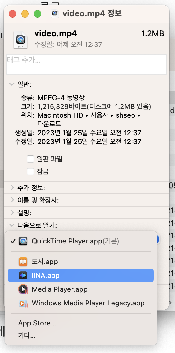 | 2. 다음으로 열기 탭 클릭 > 퀵타임플레이어가 나오는 리스트 클릭 > 바꾸고자 하는 어플리케이션 선택 |