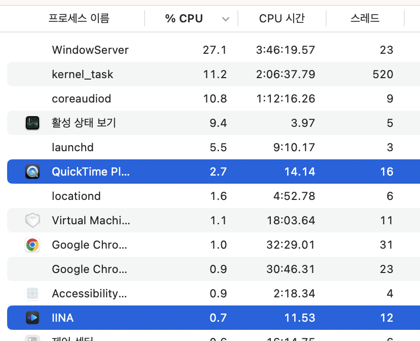 IINA와 기본 앱인 QuickTime Player를 비교해보았습니다. (M1 Pro 맥북에서 진행하였습니다)