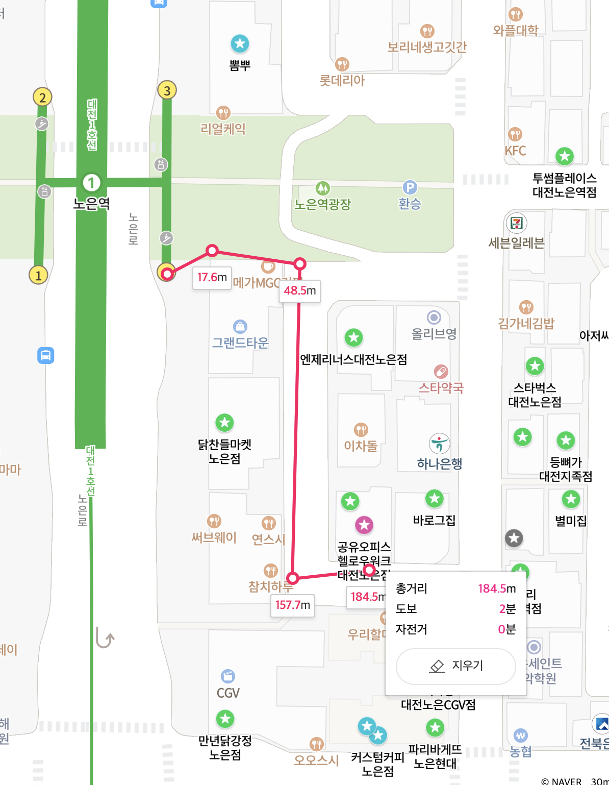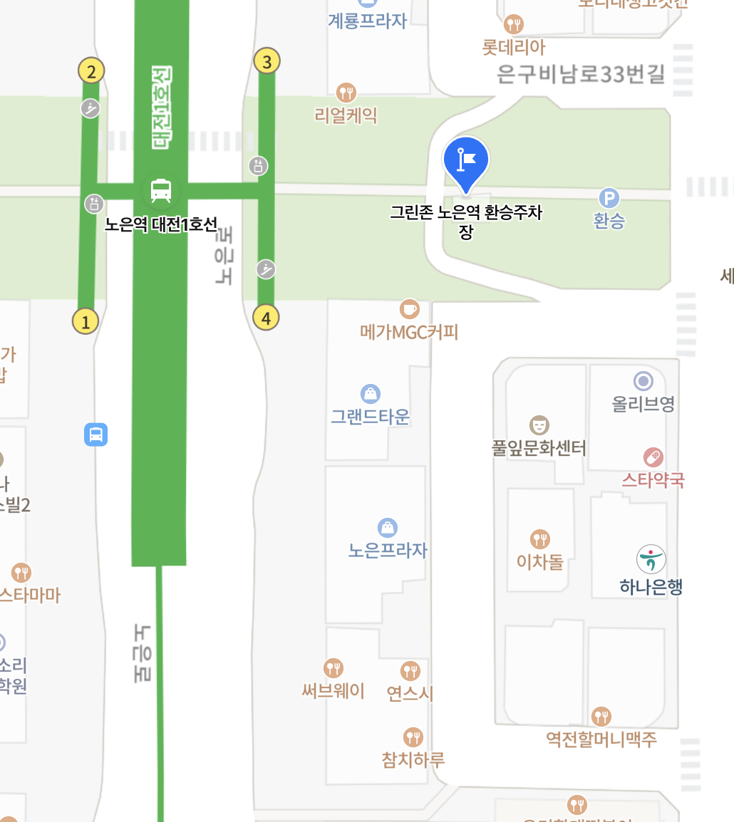 위치도 노은역에서 4번 출구로 나오면 5분안에 갈 수 있는 거리에요.