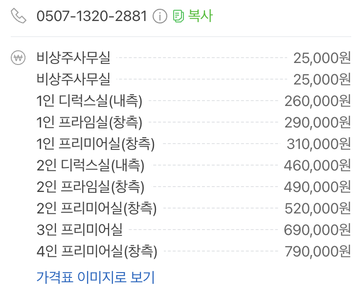 1인실 부터 4인실 까지 있고, 같은 2인실 이어도 크기나 위치에 따라 가격이 달랐습니다.