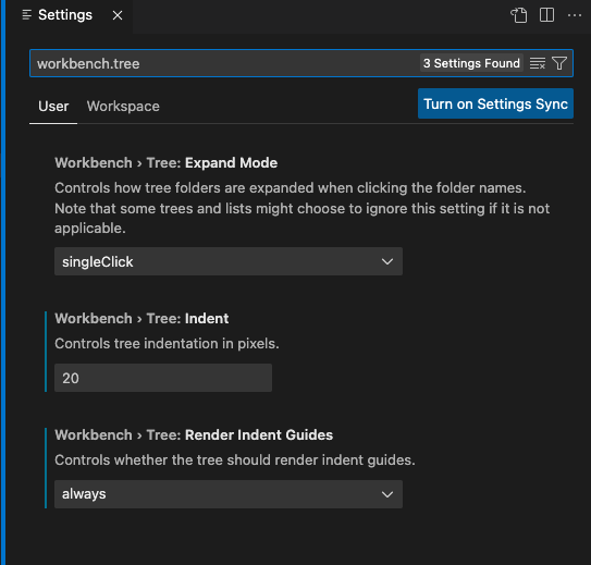 workbench.tree.Indent : 10 -> 20 으로 변경