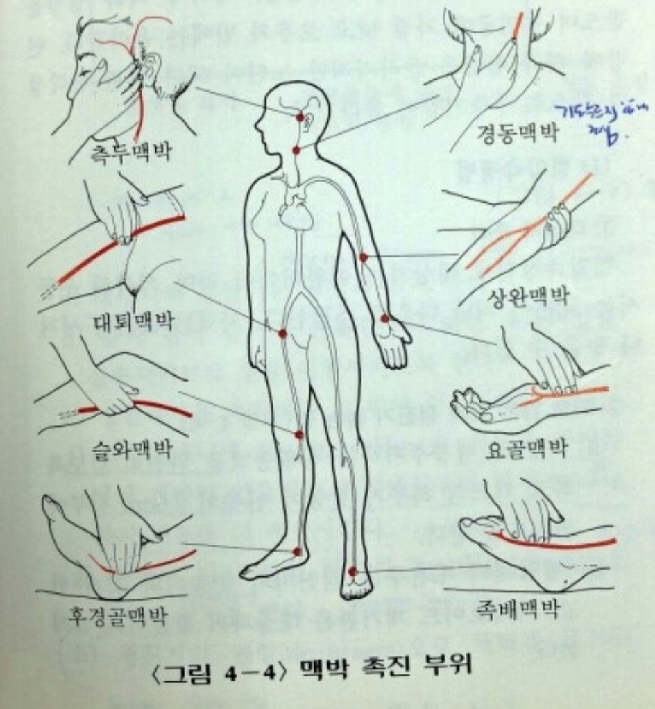 흔히 알려진 경동맥박, 요골맥박 말고도 다른 부위(측두맥박, 대퇴맥박, 슬와맥박, 후경골맥박, 족배맥박, 상완맥박)가 있다.