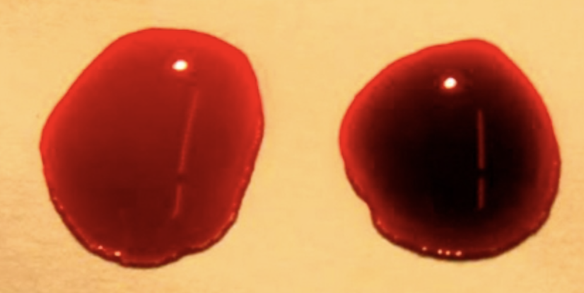 산소랑 결합될때는 밝은 붉은색을 띄고, 이산화탄소랑 결합될때는 어두운 붉은색을 띄게 됩니다.