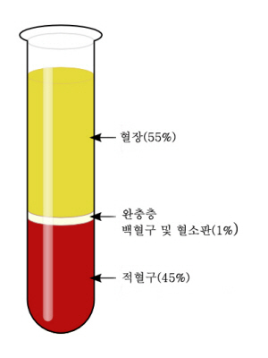 그 중 적혈구는 혈액 전체 부피의 45%를 차지합니다.