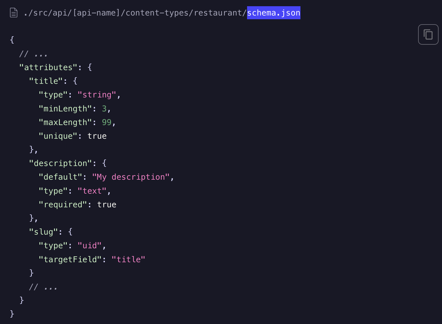 api 해당하는 content-types 폴더안에, schema.json 파일로 이동합니다.