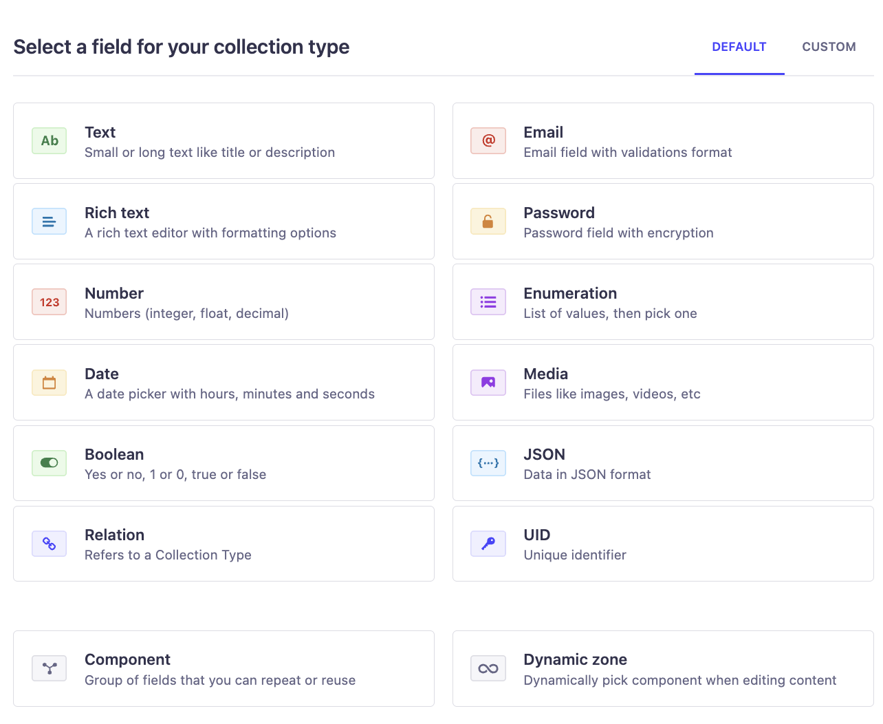 Text, Email, Rich Text, password, number, enum, date, media, json, boolean, uid, relation collection.