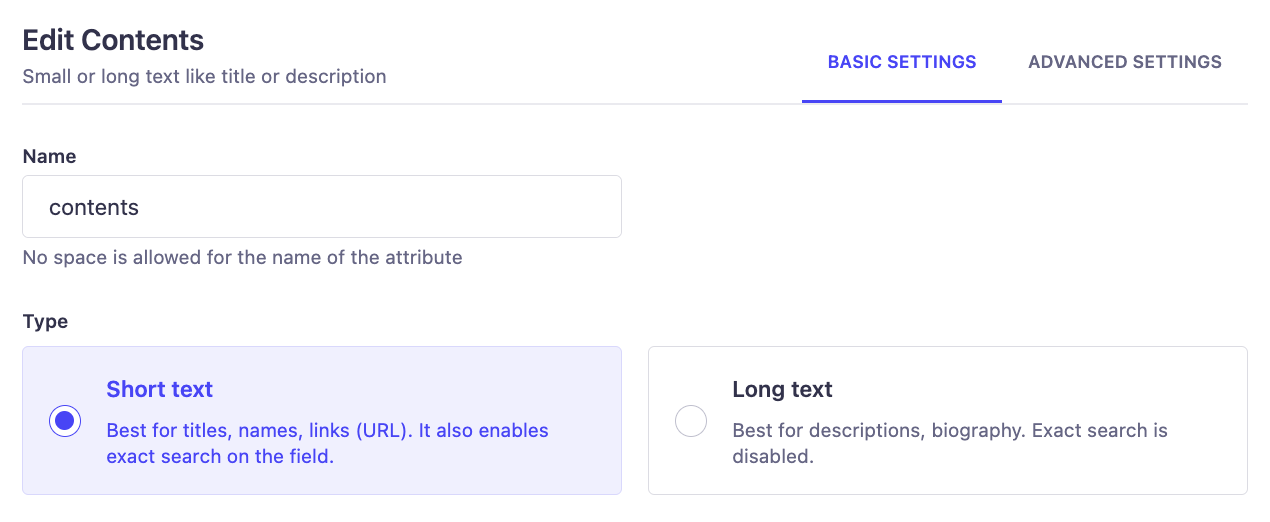 attributes안에 있는 title필드를 예로 들면, text로 만들게 되면 기본적으로 "type":"string" 내용만 있습니다.