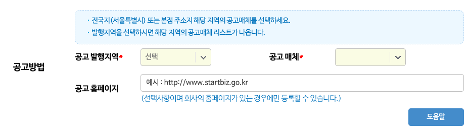 아니.. 회사 설립하러 왔는데 갑자기 공고 매체를 선택하는게 필수이고... 공고 홈페이지까지 적으라고??
