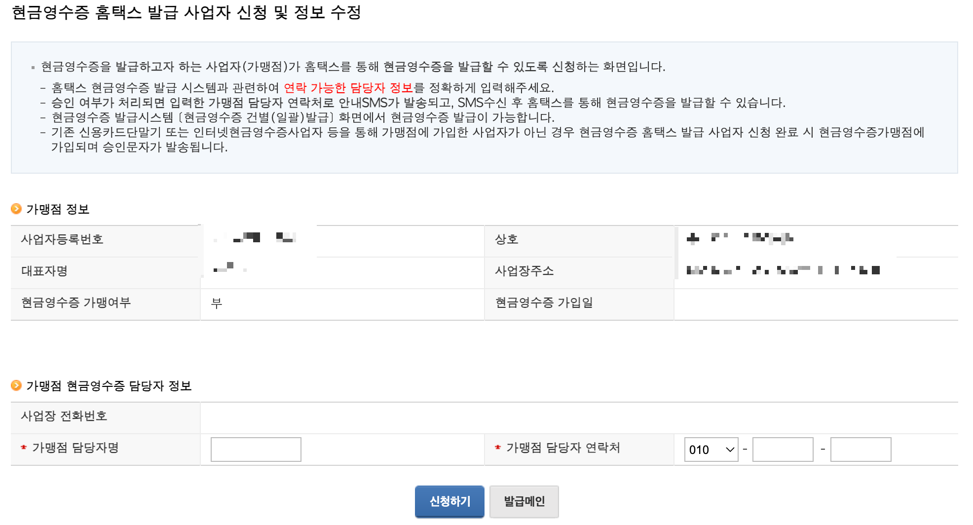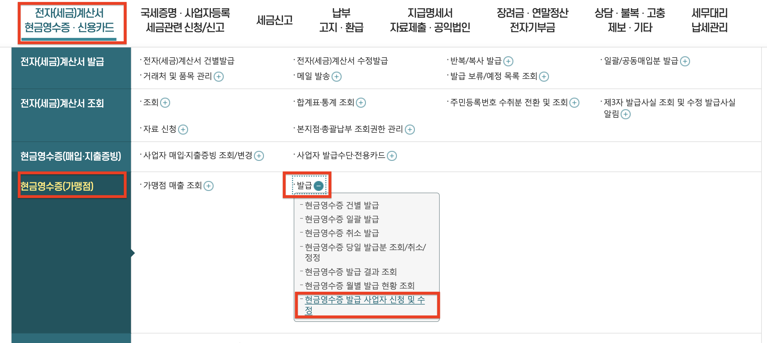 '전자(세금)계산서 현금영수증 신용카드 > 현금영수증(가맹점) > 발급 > 현금영수증 발급 사업자 신청 및 수정' 메뉴를 클릭합니다!