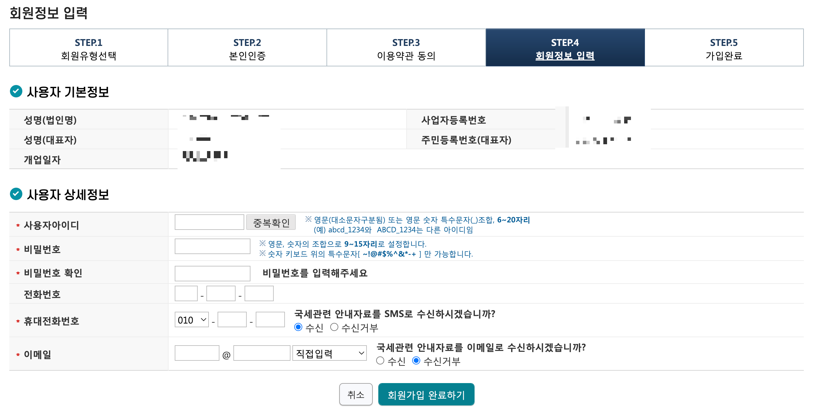 아이디, 비밀번호, 휴대폰번호, 이메일을 입력하고