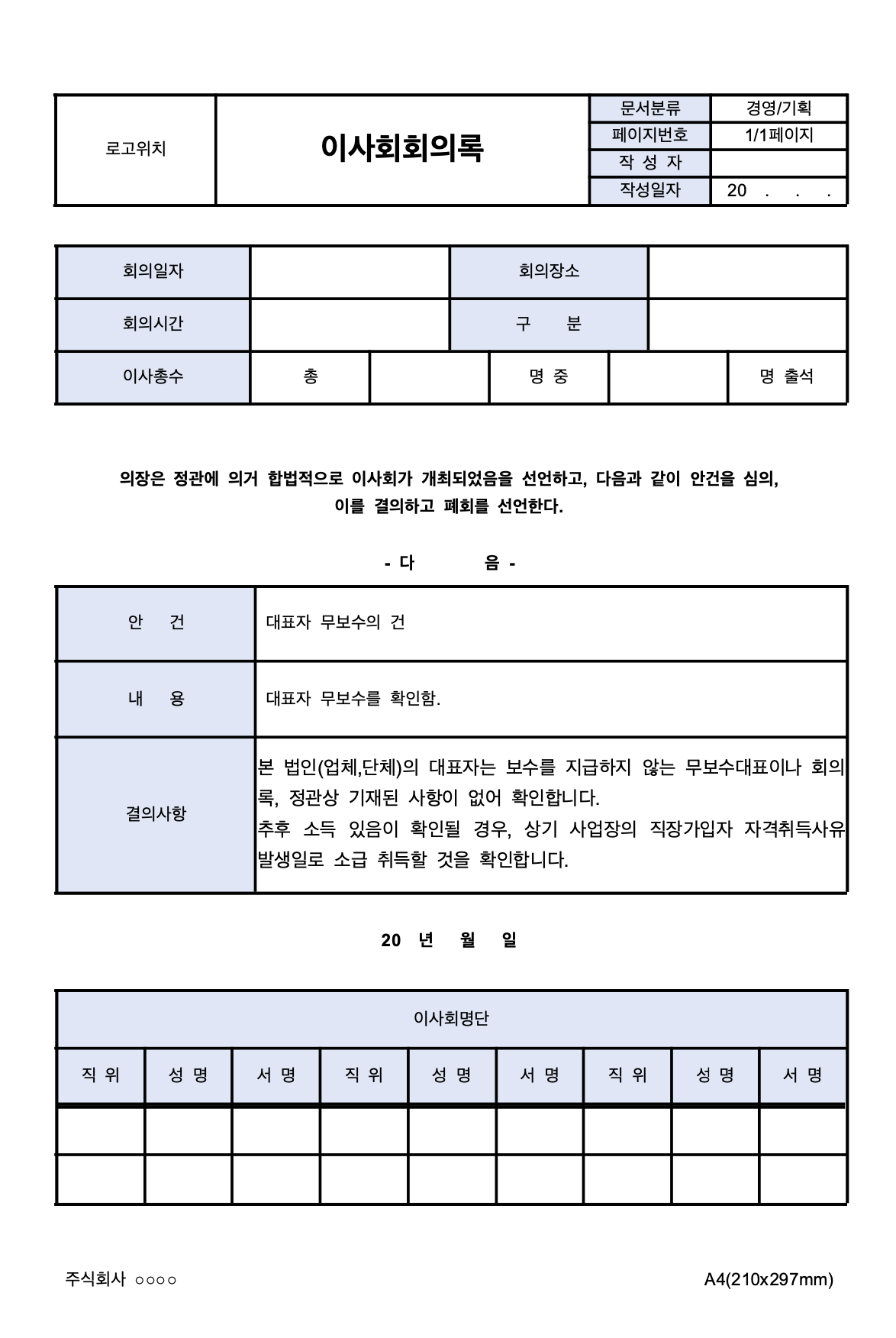 2. 이사회회의록을 통해 대표를 무보수로 결정!