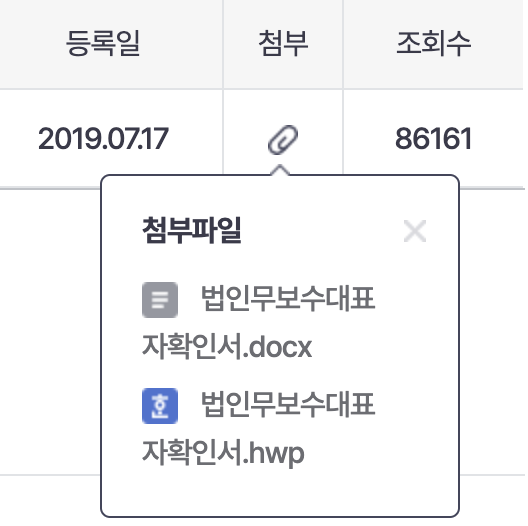 원하는 파일확장자를 가진 무보수대표자확인서를 다운받습니다.