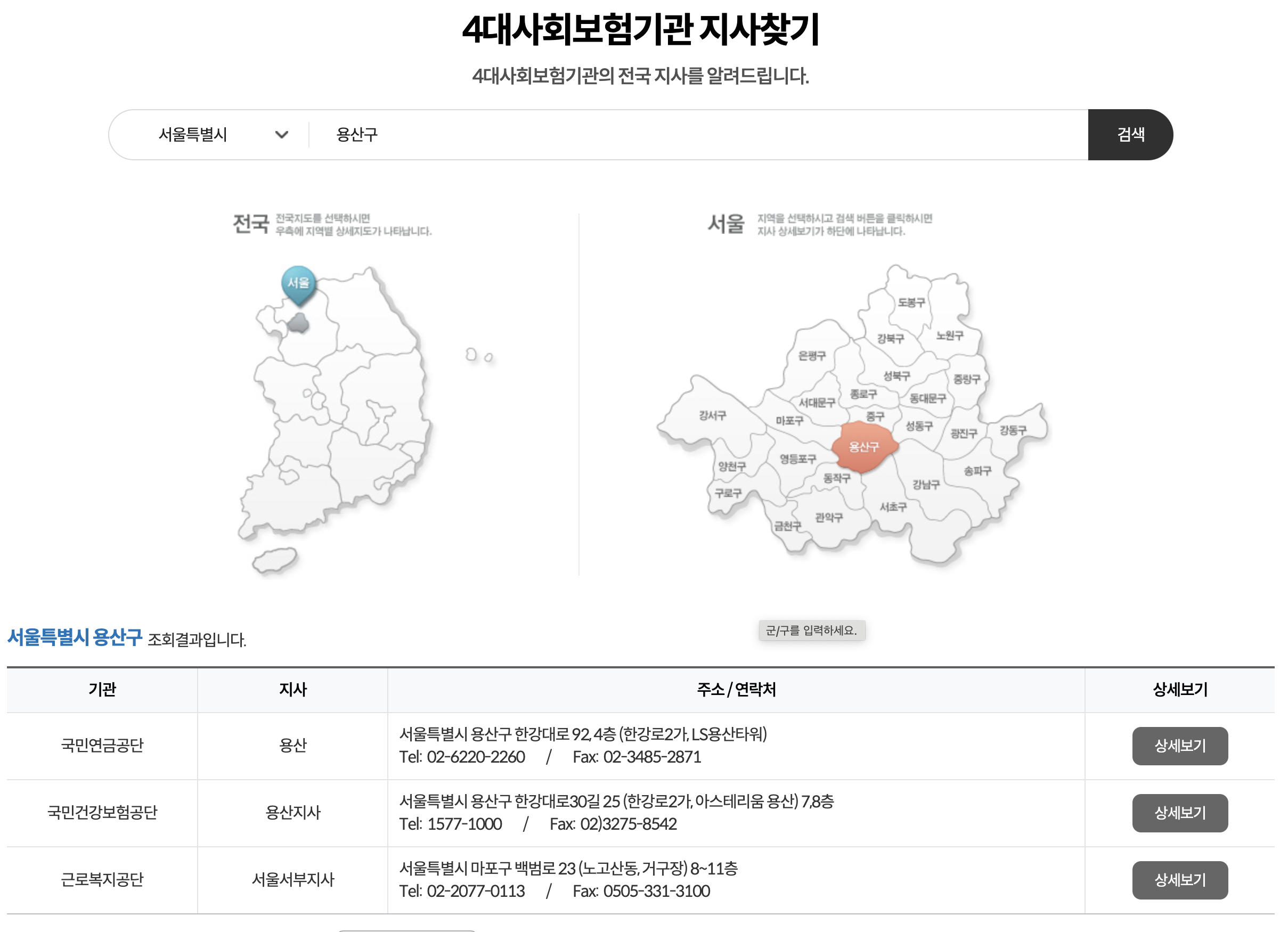 지역을 선택하시면 각 기관의 지사 전화가 나옵니다.