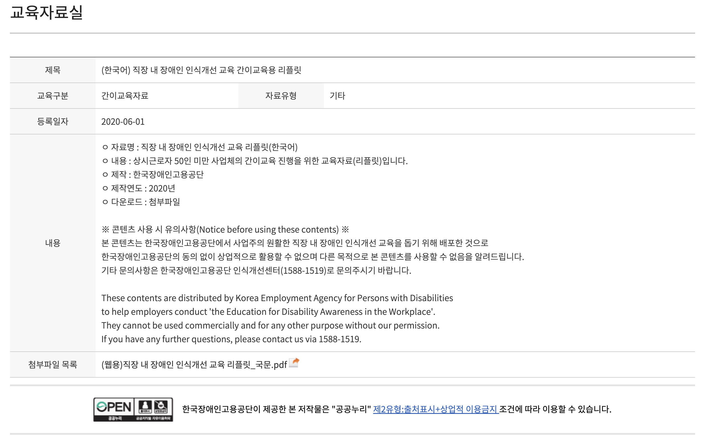 자료실 > 교육자료실 > '직장 내 장애인 인식개선 교육' 검색해서 받을 수 있습니다.