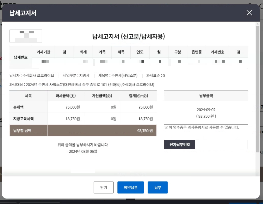 주민세가 75000원이고, 지방교육세가 18750원이네요.