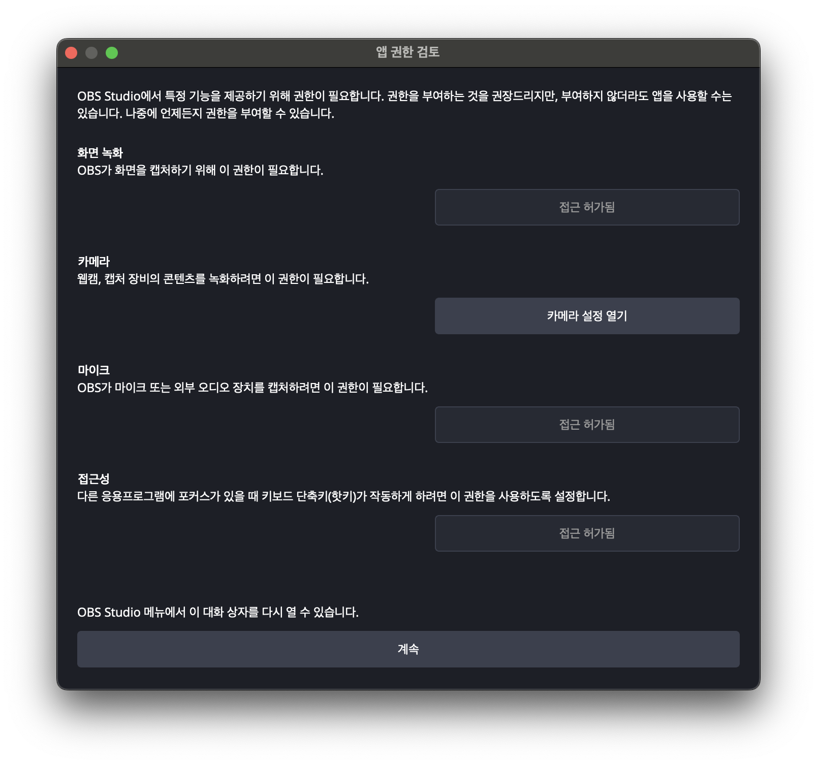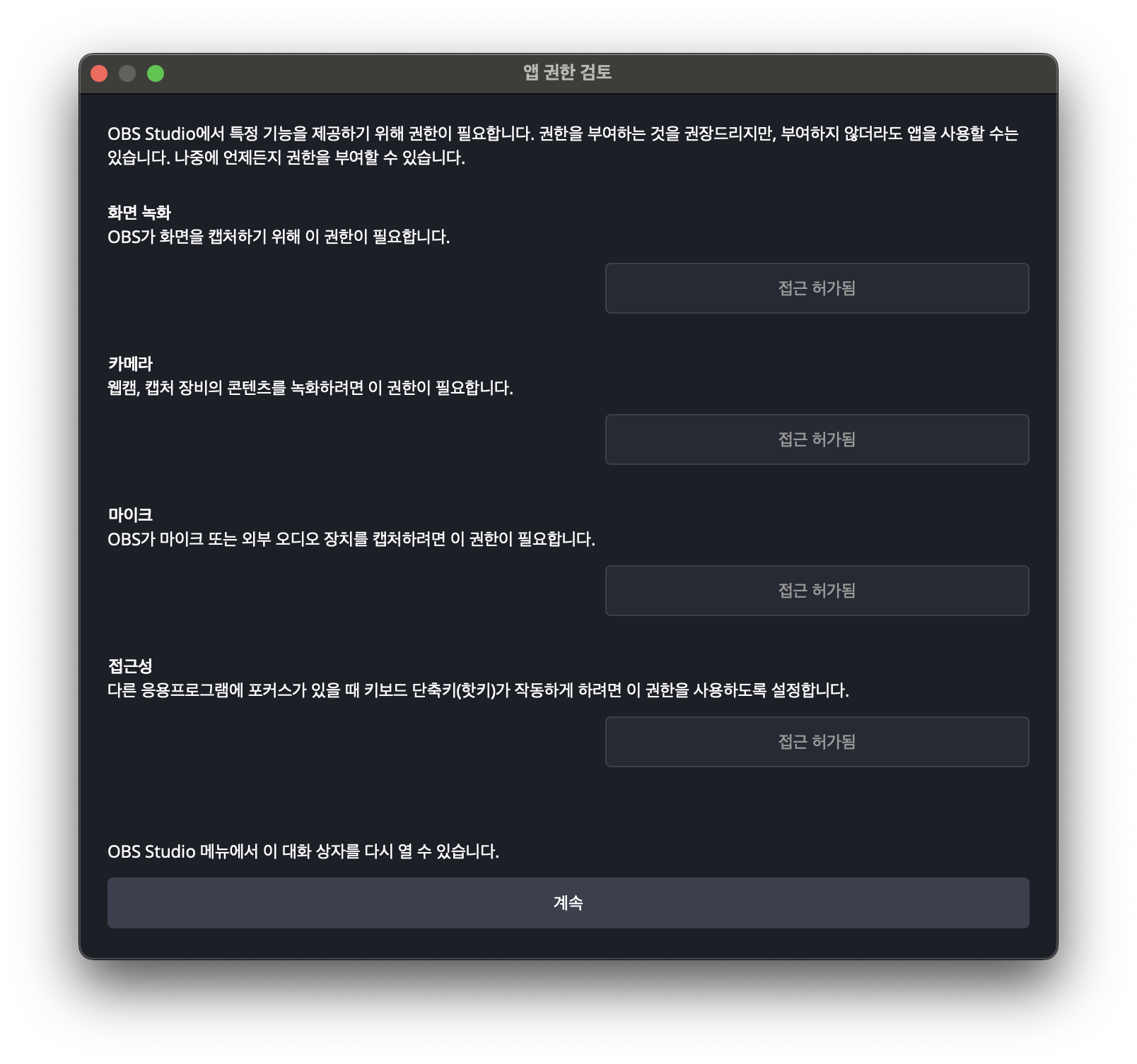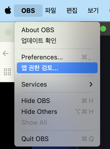 맥에서 OBS > 앱 권한 검토... >