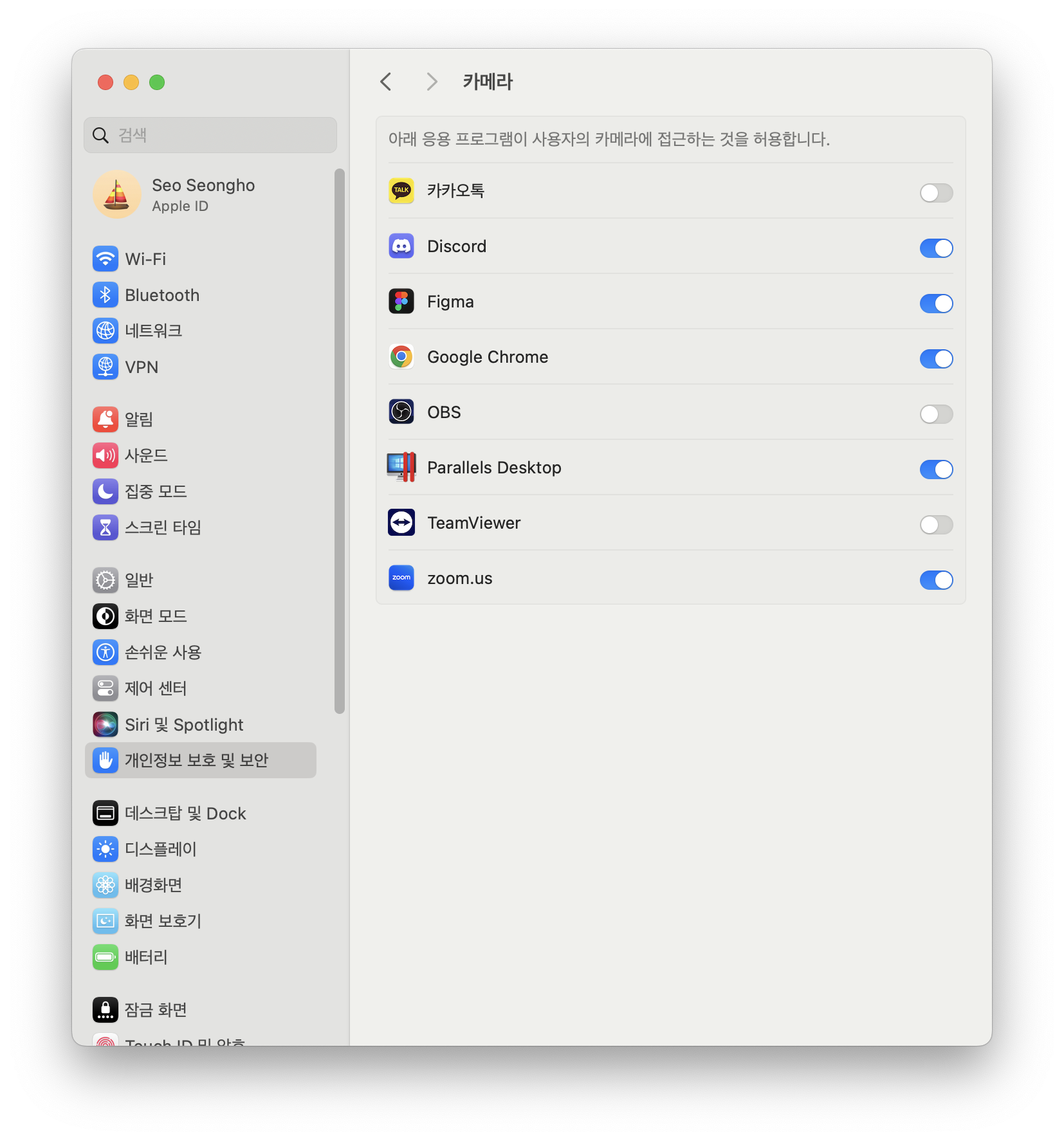 맥OS의 설정앱(Settings App > Privacy and Secure > Camera, 설정앱 > 개인정보보호 및 보안 > 카메라)으로 이동됩니다.