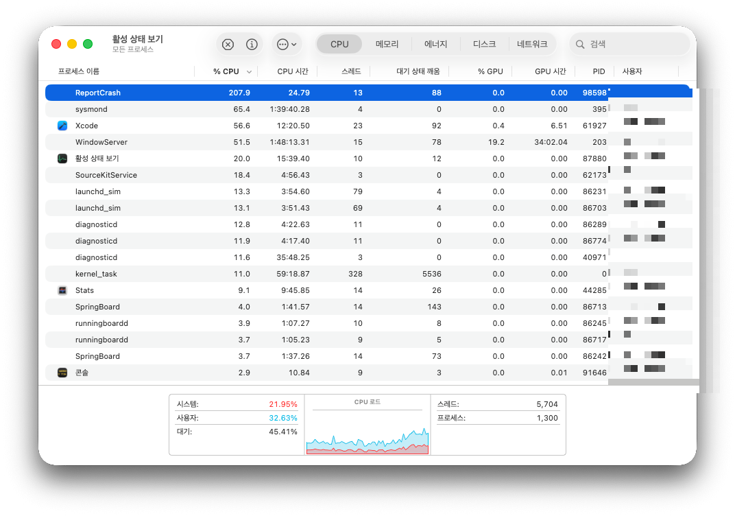 The activity status view app shows that the ReportCrash process is consuming a huge amount of CPU.