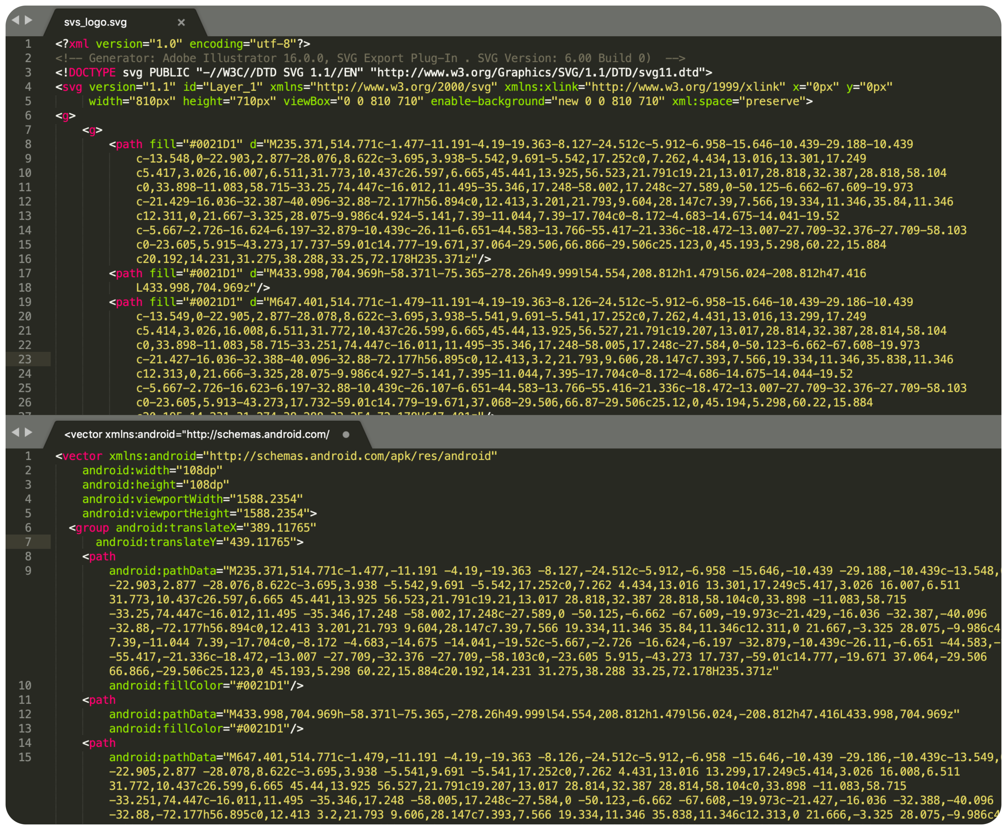 SVG파일을 가지고 안드로이드 스튜디오의 Image Asset 기능을 통해서 어댑티브 아이콘을 만들게 되면 SVG가 안드로이드에서 읽을 수 있는 Vector 파일로 변경이 됩니다. 엄청 비슷하지만 태그명과 태그의 파라매터 명이 다르곤 합니다. (svg▸vector, g▸group)